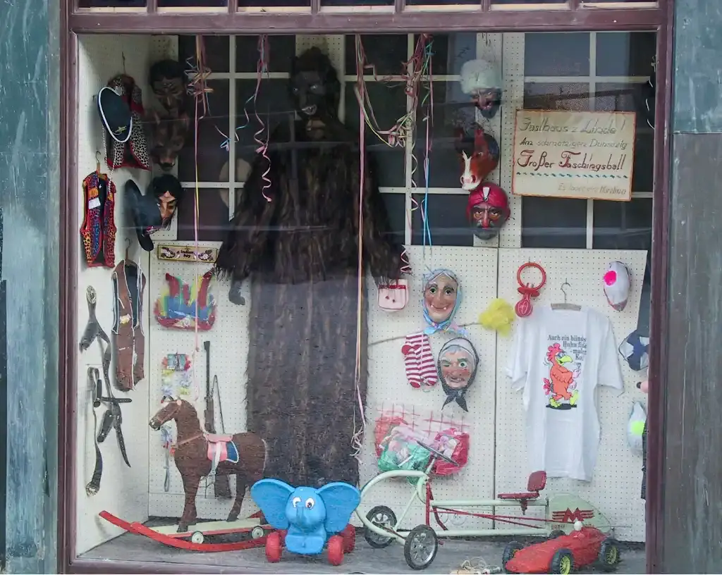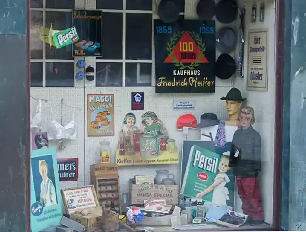 Die Schaufenster sollen die Kundschaft in den Laden locken. Sie sind der Teaser, der dafür sorgt, dass das Interesse der Menschen geweckt wird. Hier sehen Sie, was im Kaufhaus zu finden ist. Spielzeug, Fastnachtsartikel, Kurzwaren, Gewürze, Waschpulver, Miederwaren und vieles mehr … verleiten die Besuchenden, das Kaufhaus Pfeiffer zu betreten.