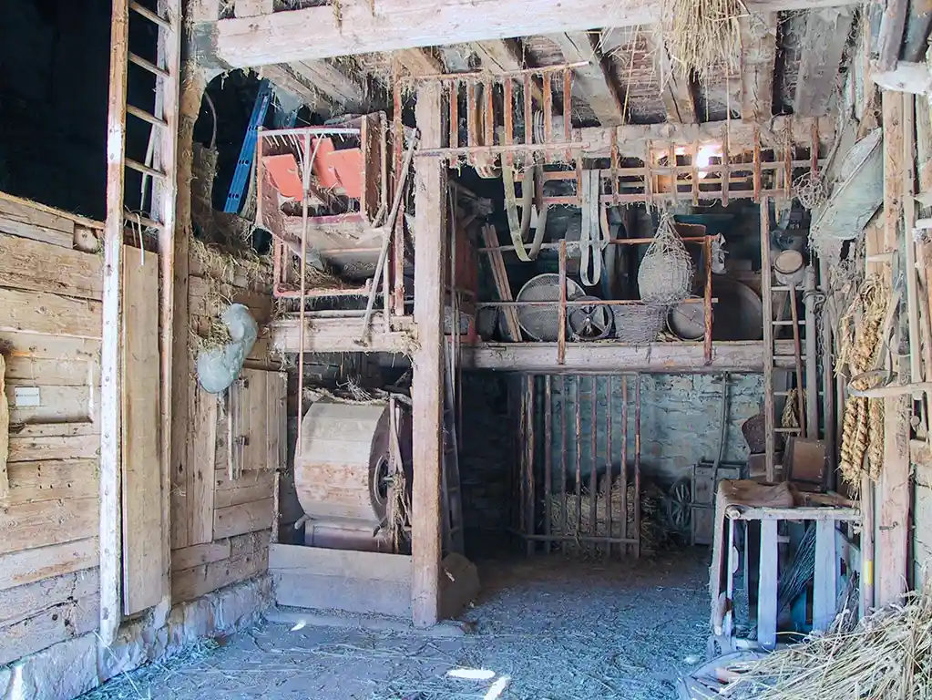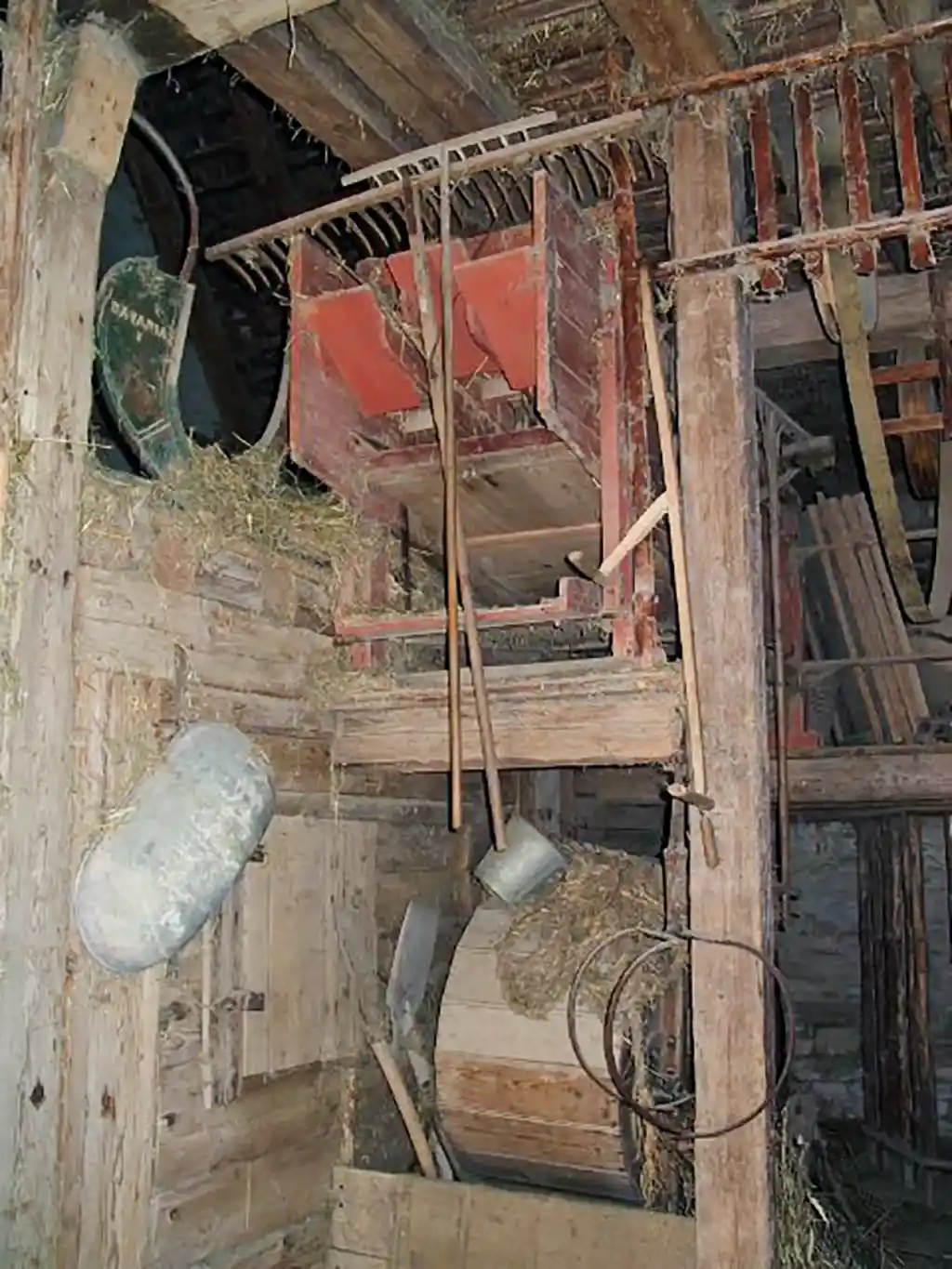 Auch in der Scheune treffen wir auf vieles, das sich über Jahrhunderte kaum verändert hat. Die Form des Einhauses bringt es mit sich, dass alles, was im Haus gelagert werden soll, in die Stauräume hoch bis unters Dach geschafft werden muss. Dafür gab es das „Obertenloch“. Im Dachspitz hing eine Umlenkrolle. Ein umlaufendes Seil mit einem Haken vervollständigte den Handaufzug. Holz, Heu, Stroh oder Getreidevorräte mussten irgendwie, aber immer mit Muskelkraft, nach oben verfrachtet werden.