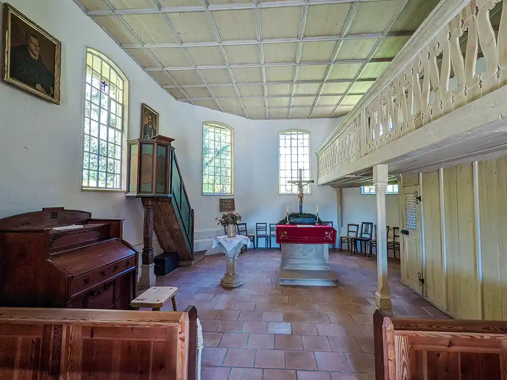 Nachdem der württembergische Herzog Ulrich von Württemberg 1534 den protestantischen Glauben angenommen hatte, mussten mit ihm all seine Untertanen und damit auch das Dorf Tischardt evangelisch werden. Auch im Freilichtmuseum ist die kleine Kirche deutlich als evangelisch erkennbar. Man kann es so sagen: Was fehlt, zeichnet sie aus – die stark zurückgenommene Einrichtung und die gedeckten Farben.