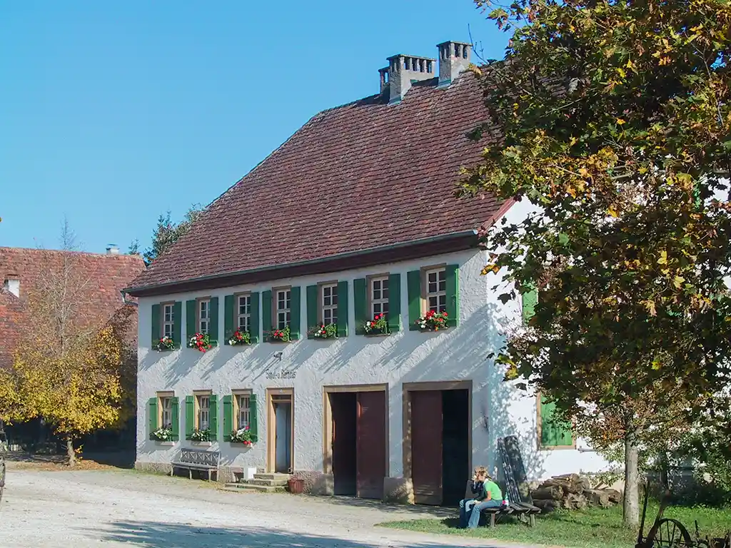 Das Schul- und Rathaus, markant am Dorfplatz, ist unverkennbar das größte Gebäude des Freilichtmuseums. Erbaut hat es die Gemeinde Bubsheim auf dem Großen Heuberg, Landkreis Tuttlingen, im Jahr 1830. 1988 fand es seinen Weg ins Freilichtmuseum.
