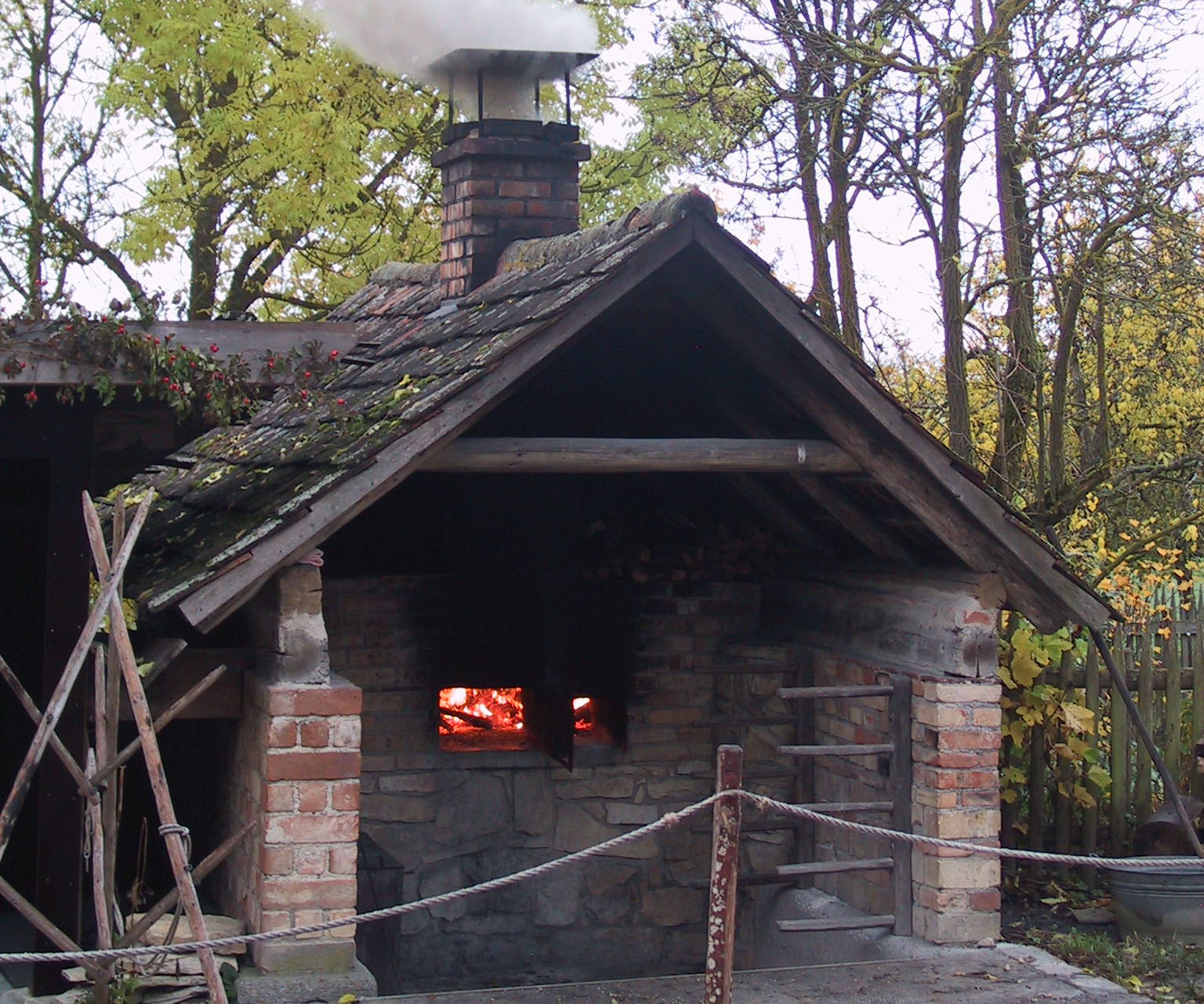 Foto: Kleines Haus mit Back mit Wänden aus Backsteinen und eingemauertem Ofen, in dem ein Feuer brennt. Aus dem Schornstein steigt dichter weißer Rauch auf. Das Backhaus ist von herbstlich aussehenden Bäumen umgeben.