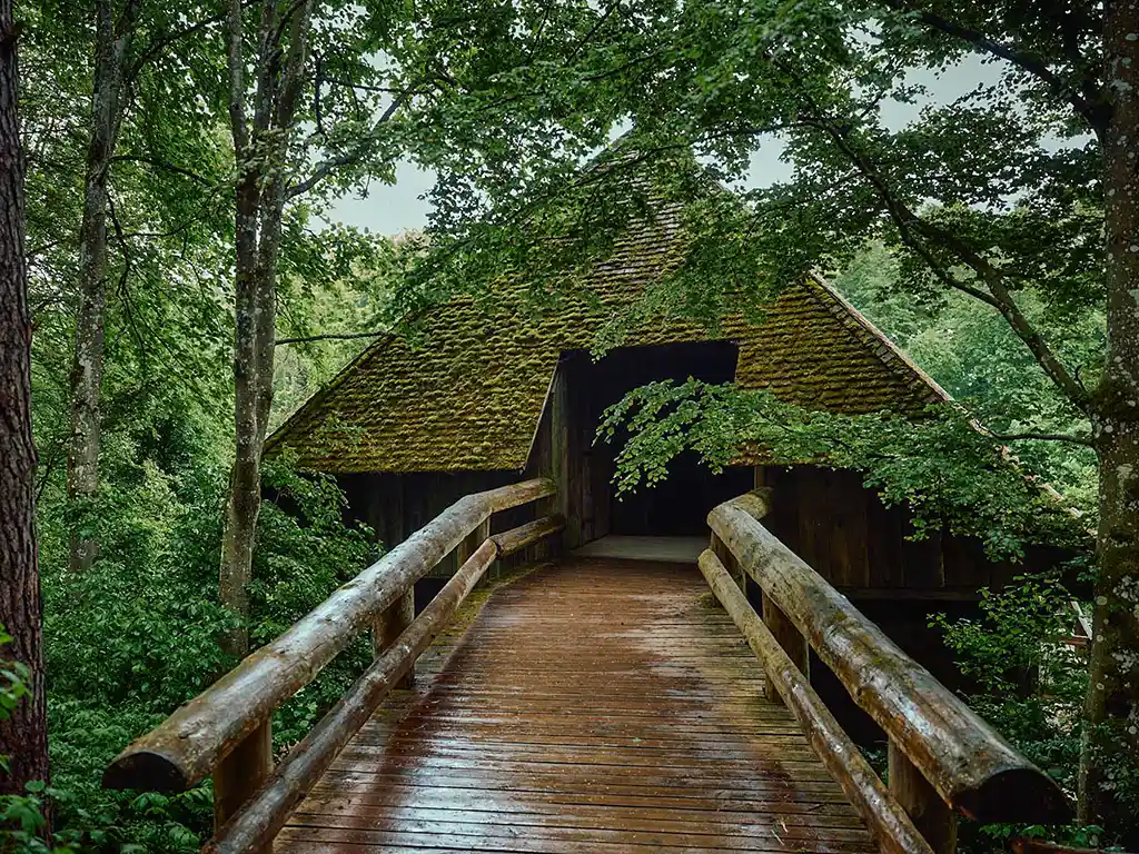 Foto: Holzbrücke mit Geländer führt durch einen schattigen Wald zu einem Gebäude mit steilem, hohen Dach. Sonnenlicht fällt durch die Baumkronen auf den Weg.