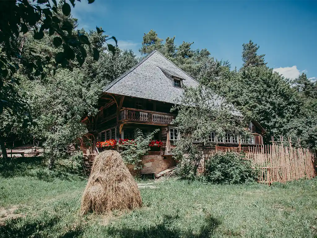 Foto: Großes Haus steht auf einer Wiese, umgeben von Bäumen. Die Fassade ist aus dunklem Holz, mit Balkon und leuchtend roten Blumen unter den Fenstern. Auf der Wiese liegt im Vordergrund ein Heuhaufen.