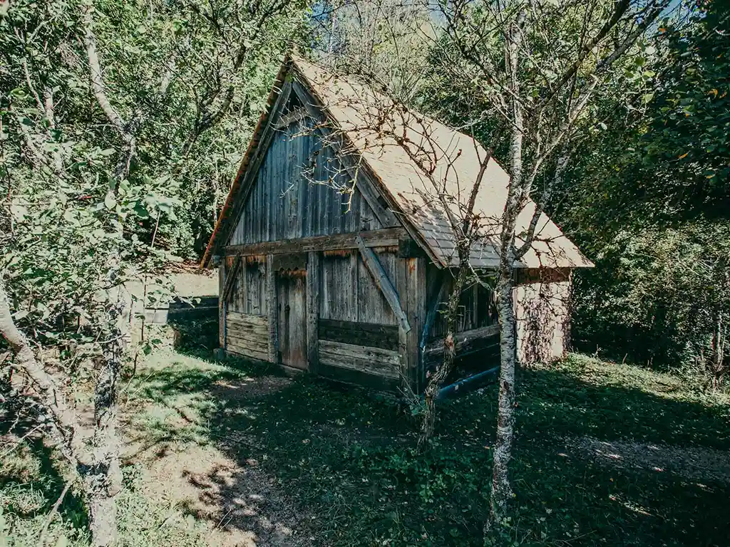 Foto: Kleines, einfaches Waschhaus aus Holz mit steilem Dach, umgeben von Bäumen und Gebüsch.