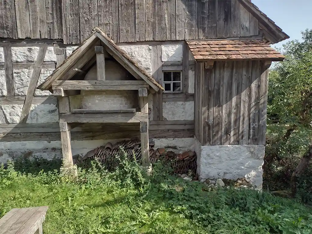 Außen am Haus, zur Straße hin, sticht ein Dörrofen für Flachs und daneben der Abort ins Auge. Beides lässt sich auch innen im Haus von der Küche aus zu erkennen.